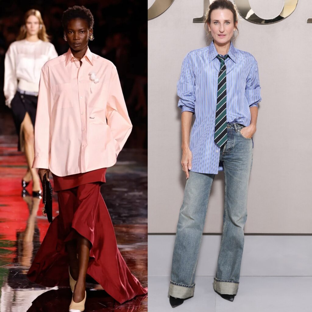 Chanel gave fresh life to the white shirt this season, reminding us that a classic piece can still feel modern when the proportions change. Wear it loose over jeans and flats, tucked into tailored trousers, half-buttoned with a long skirt, or exaggerated at the top to create volume.