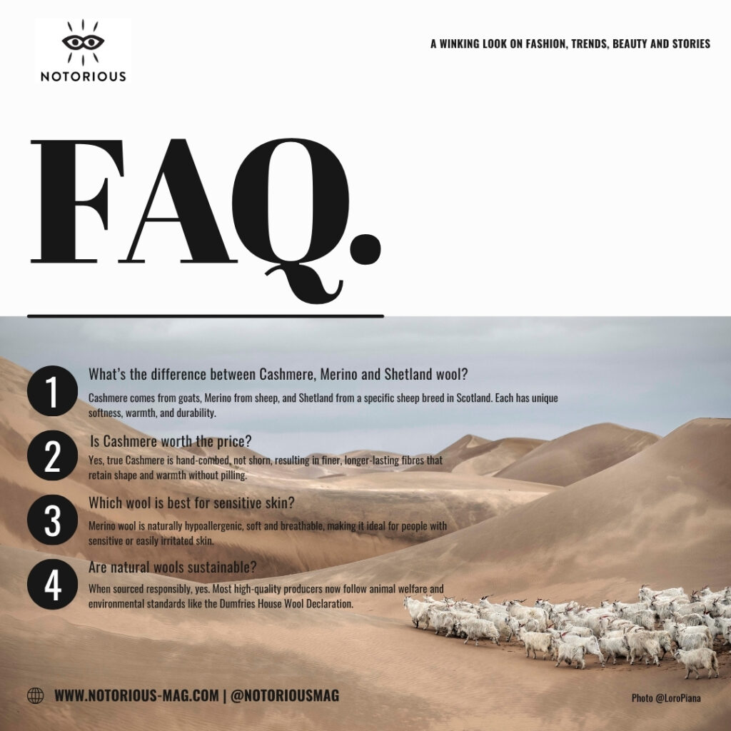 FAQ Graphic featuring cashmere goats from the Mongolian desert. Herders harvest the fibre between March and May, when the climate is milder and the animals tend to naturally lose the soft, warm cashmere undercoat that protected them during the colder months. Photo courtesy @LoroPiana