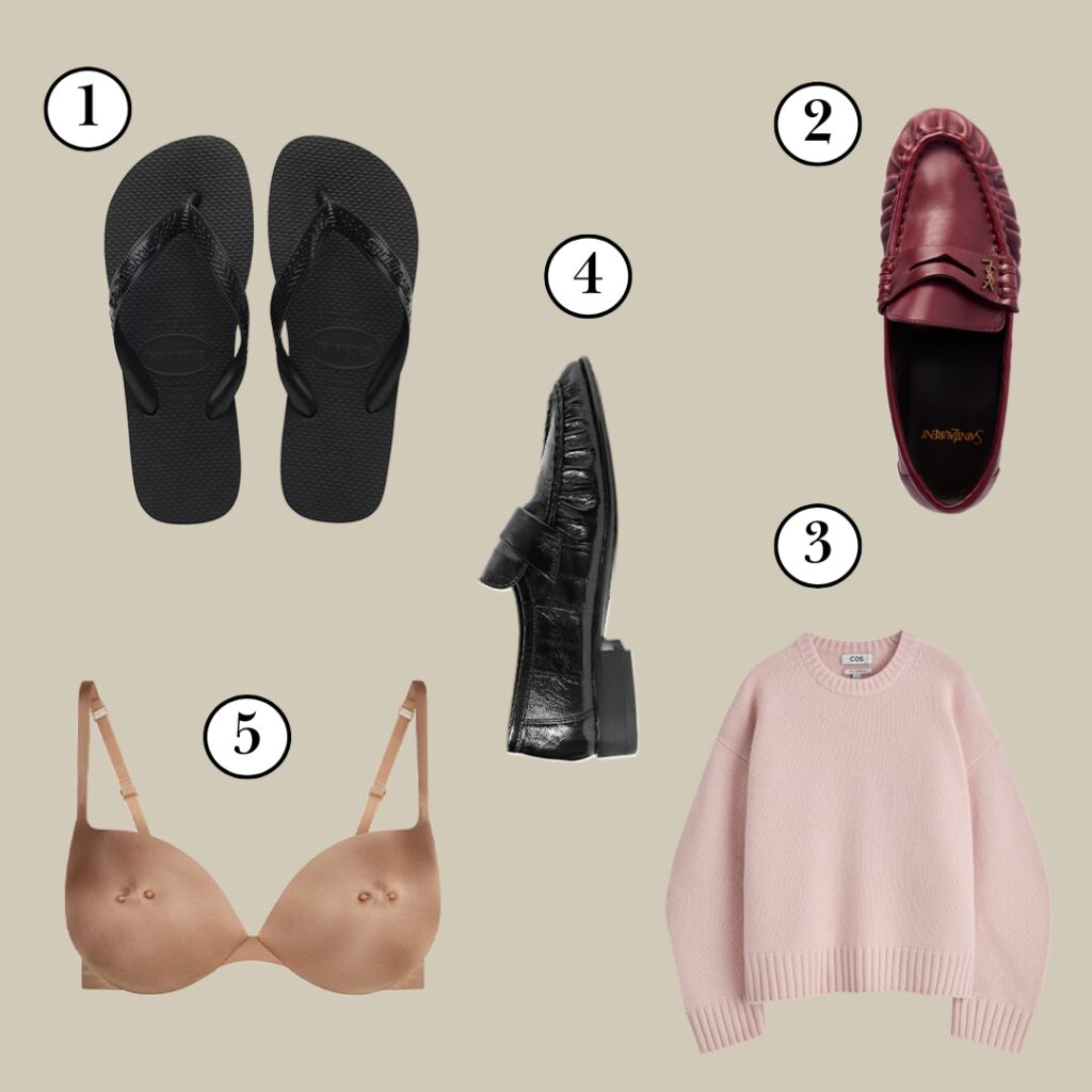 1- Havaianas 2- Saint Laurent Loafers 3- COS Cashmere 4- The Row Loafers 5- Skims Pierced Nipple Push-Up Bra
