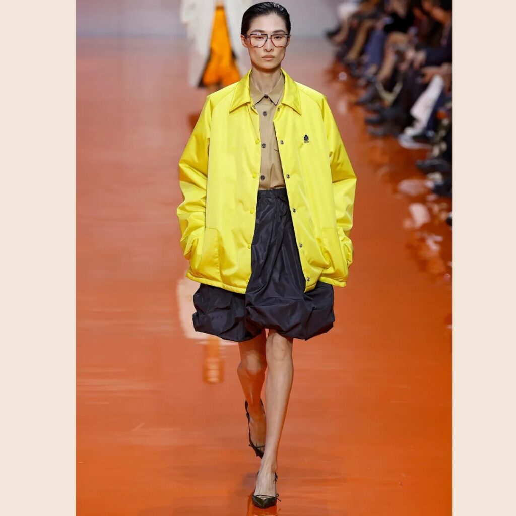 Prada’s secret weapon? Colour clashes that shouldn’t work but somehow do. A black skirt and beige blouse suddenly feel alive when you add a canary-yellow piece. Miuccia Prada and Raf Simons suggest fearless combinations: