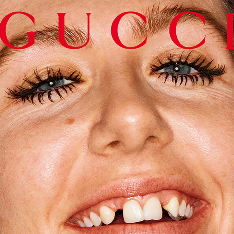 Gucci asked British photographer Martin Parr to shoot musician Dani Miller to advertise Gucci’s new mascara L’Obscur. For the ad, the gap-toothed frontwoman of a punk garage band appears with almost no makeup except for the heavy-coated black mascara. Besides flashing unapologetically her gap-toothed smile and some wrinkles, the singer also has natural eyebrows that she’s probably never plucked once in her entire life. While smiling and dancing to an ‘80s song, Dani states, “When eyes are on you, you need eyes that are everything.”